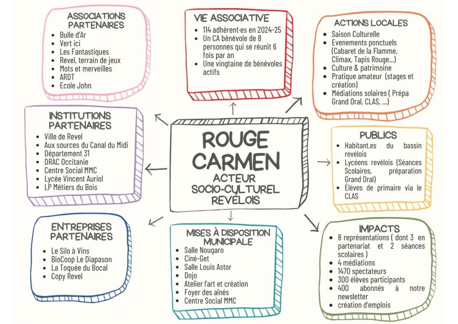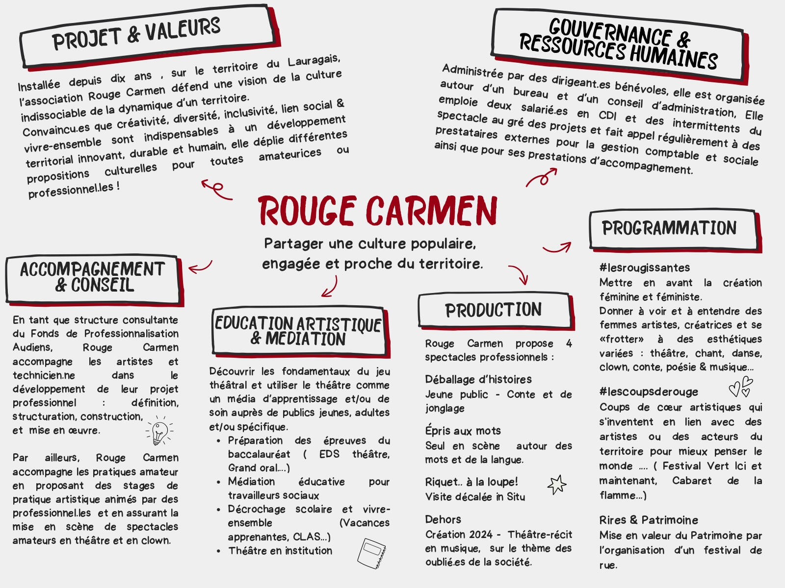 Qu'il s'agisse de libérer la créativité, d'inventer des propositions culturelles sur-mesure ou de structurer le projet professionnel des artistes et technicien·es du spectacle, Rouge Carmen est là pour vous écouter et répondre à vos besoins.